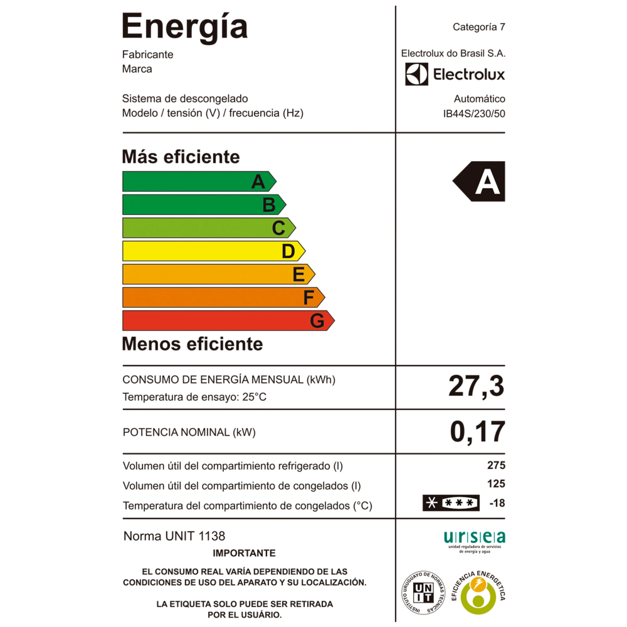 Gas Refrigerante R600a / Eficiencia energética A